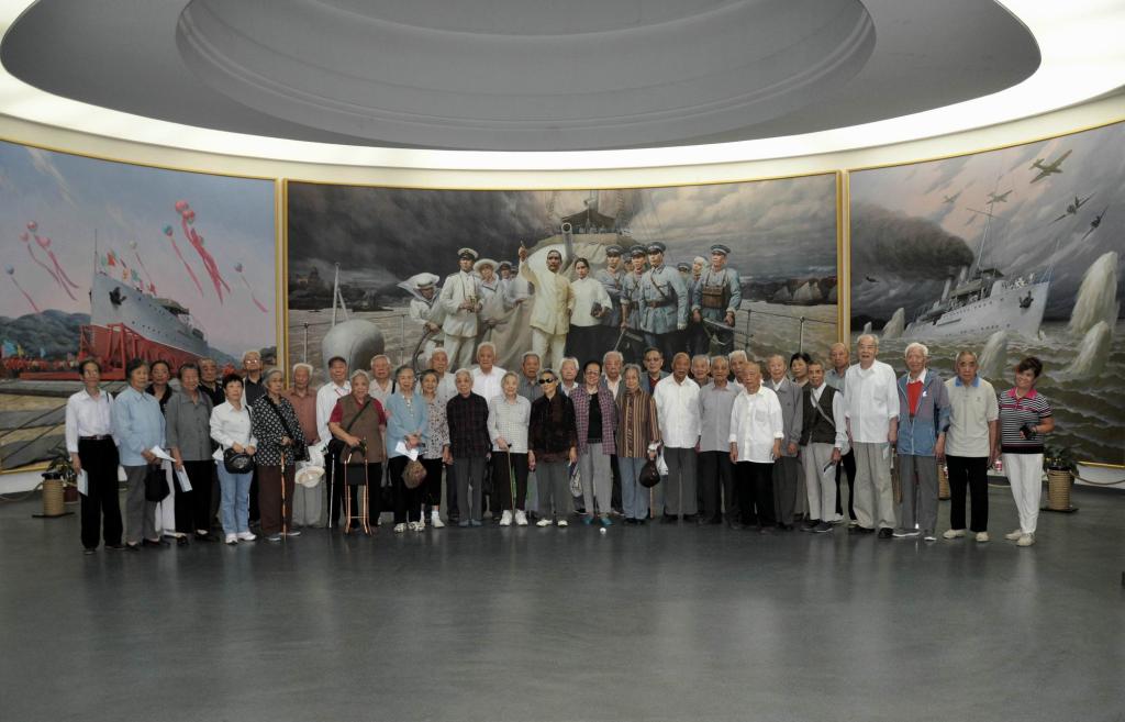 随后,全体老同志在中山舰博物馆内巨幅宣传画前合影留念。