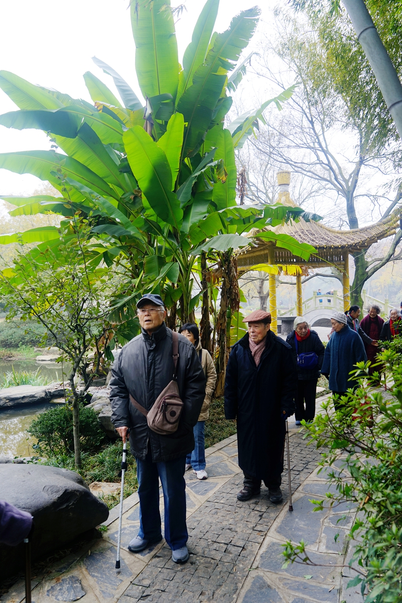 进入磨山南麓植物园区,老同志先后参观游览了荷园、杜鹃园、盆景园、水生花卉区、紫薇园等景观。满山杜鹃,千姿百态,品冠中南之首;经年桂花,独树一帜,久赋胜誉;绿水冬荷,传世珍稀,翠盖华章。天人合一、生态娴适的自然风光给老同志们留下深刻的印象。