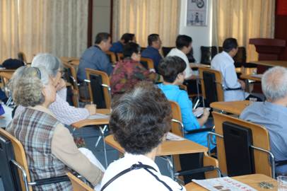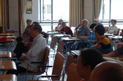 本次公益讲座和心理辅导的教授仍是湖北省老年学学会老年心理学专业委员会的专家,由武汉市宝丰路军队干部休养所研究员刘大桂(左一)、武汉大学人民医院精神卫生中心副教授成敬(左二)、华中师范大学心理学院教授洪建中(左三)、武汉大学发展与教育心理研究所教授戴正清(右二)、武汉理工大学心理健康所教授雷五明(右一)和武钢退管中心宣传调研部部长刘佳组成。