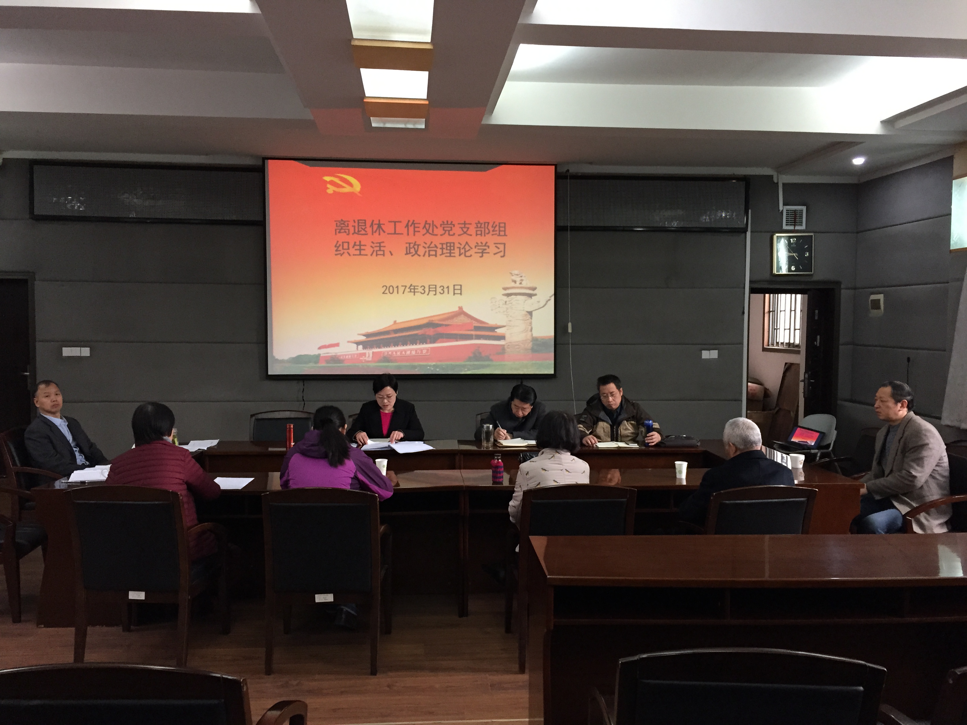 3月31日上午,离退休工作处党支部在行政楼二楼会议室召开支部组织生活会,会议主要学习习近平在全国高校思想政治工作会议上的讲话精神、全国“两会”精神和2017年全省老干部工作“四先”表彰大会暨全省老干部工作会议精神等,通过理论学习切实增强广大党员对相关精神的准确把握和深刻领会。会议由支部书记纪红主持,离退休工作处全体党员参加。