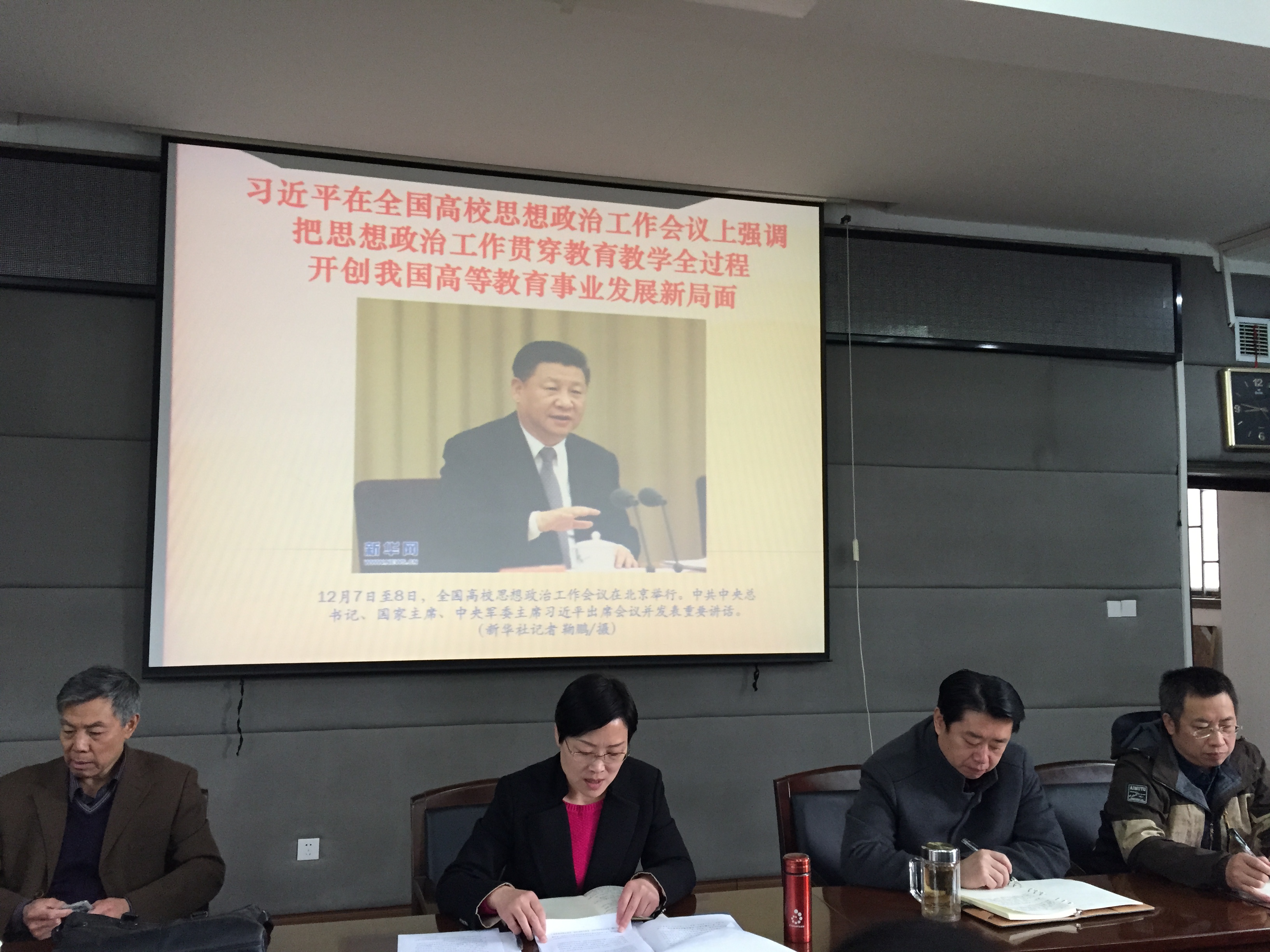 纪红同志首先向大家传达了习近平总书记在全国高校思想政治工作会议上重要讲话精神。她说,习近平总书记的重要讲话是指导做好新形势下高校思想政治工作的纲领性文献,意义十分重大,我们大家要深入学习领会。随后与会党员一起学习了2017年全国“两会”80个热点名词,其中“三去一降一补”、“河长制”、“工匠精神”等这些报纸网络热搜名词引起了大家不小的兴趣;接着纪红同志又对全省老干部工作“四先”表彰大会暨全省老干部工作会议主要精神进行了传达,报告我校离休党总支东区党支部被评为全省先进离退休干部党支部;最后李翠红同志向大家宣读了机关党委2017年工作要点。