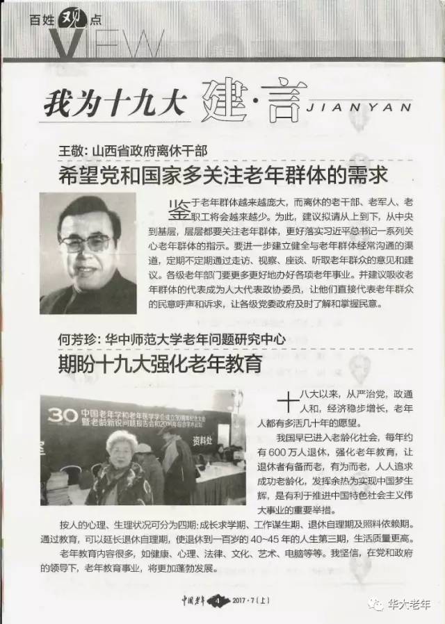 《中国老年》2017.7月号刊出我校何芳珍老师为十九大的建言。