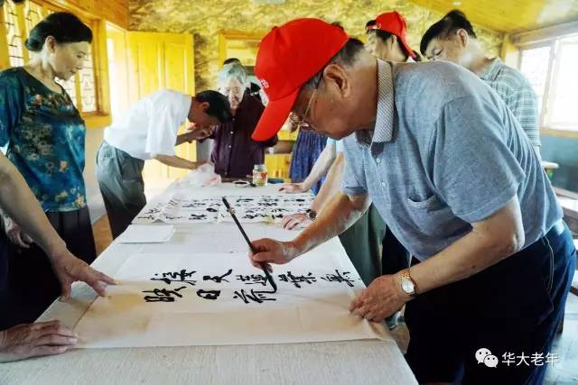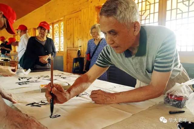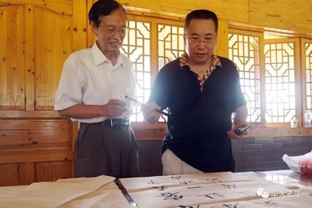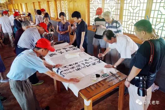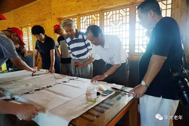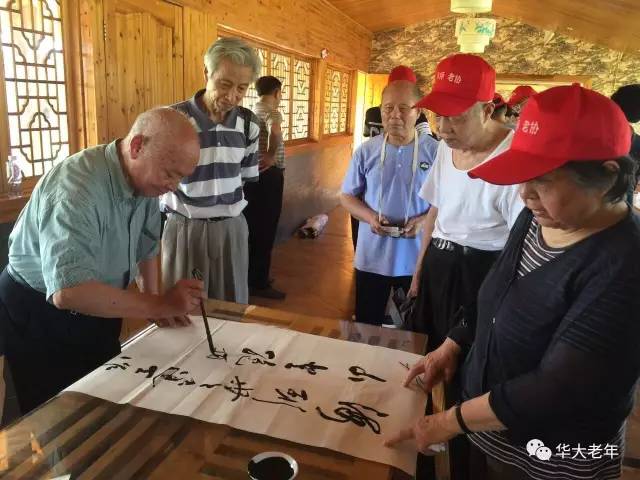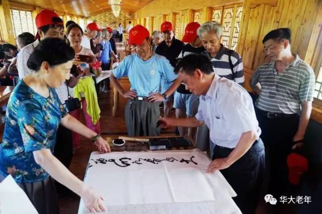 7月4日,为乡镇文化建设出力,华中师大老教授们到江夏鑫农湖万亩荷花基地参观,现场泼墨挥毫。