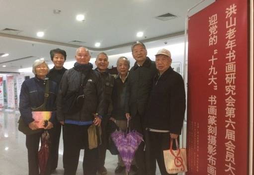 2017年10月16日星期一,冒着淅沥的小雨,我校老年书画研究会的七位退休老师于早上九点赶赴洪山区文化馆三楼参加了洪山老年书画研究会第六届会员大会暨迎党的“十九大”书画篆刻摄影展布展。