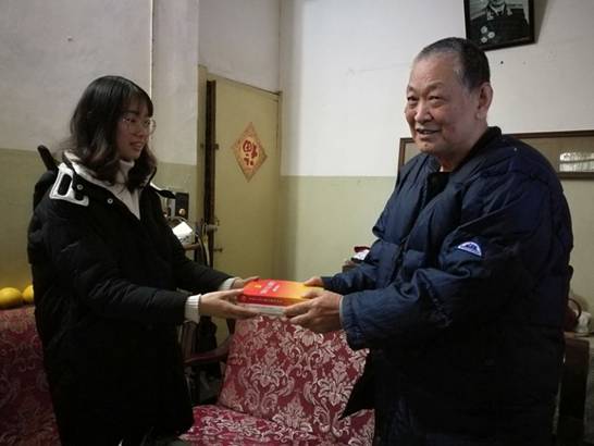12月15日下午2:30,在教育信息技术学院离退休工作联系人李世祥老师、团委副书记陈亮老师的带领下,学院本科生党支部学生代表戴晨艳等6名学生前往退休教师党员汪光林老师家中进行了探望,并开展了“青年学生党员与老红军后人、退休教师党员共学十九大”的活动。