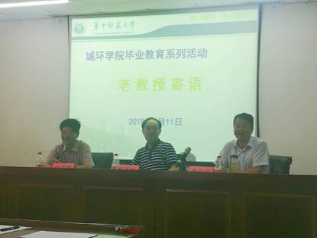 6月11日下午,城环学院举办2018届本科毕业教育系列活动之“老教授寄语”活动。学院关工委主任卢武强以及退休教授曾菊新、李家清为学生们带来了难忘的大学最后一课。学院党委副书记黎俊玲、辅导员卢雯参加活动。