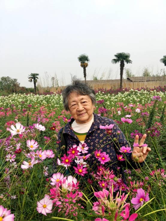 瞧,80岁的丁远翠老师蹲在花丛里,像少女一样笑得多开心。