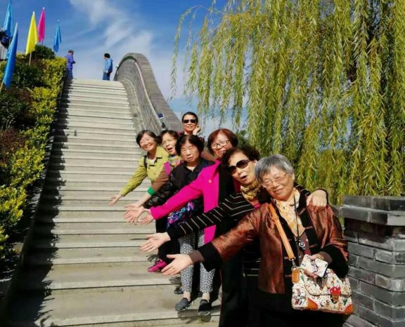 车子行进了大约一个多小时到达目的地,大家手挽手,互相招呼着进入了木兰水镇景区。大家纷纷被这里的小桥流水、粉墙瓦黛、油纸伞和乌篷船所吸引,携着自己的同伴,开始拍照留念。一群女老师们来到一座拱桥上,单手张开,摆了一个整齐又活泼的造型,与蓝天、白云、垂柳互相映衬,十分应景。天气晴朗,大家的心情也如同明媚的阳光,欢快不已。
