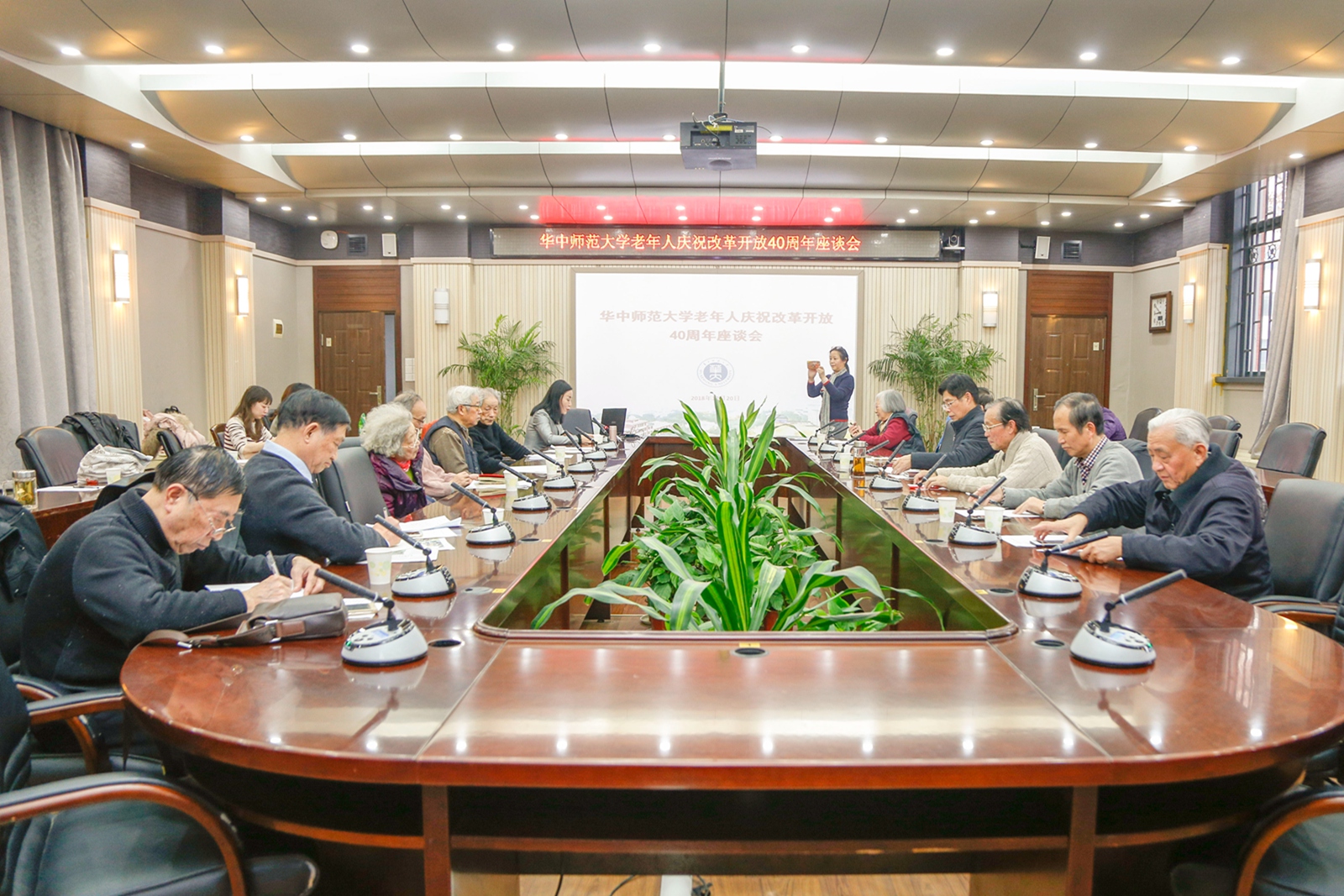 12月18日上午,行政楼一楼会议室灯火辉煌,十余位退休老教授、老专家齐聚一堂,参加由校离退休工作处、校老年人协会、校老教授协会、校关工委联合主办的华中师范大学老同志庆祝改革开放40周年座谈会。