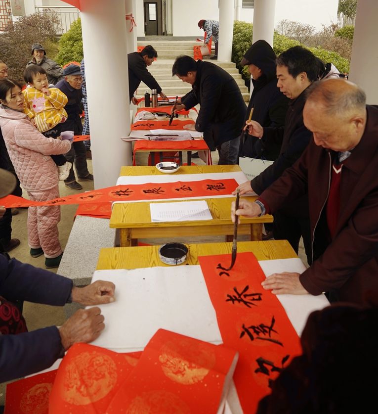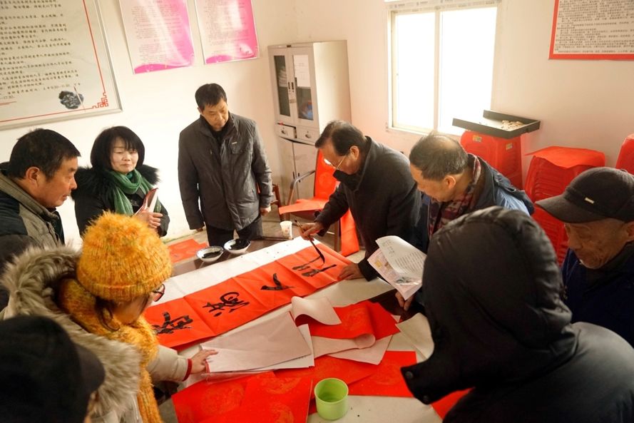 送春联是主体,在书写场地安排上,分室外与室内,迅速摆上笔墨纸砚,接待村民开始书写。书写中要讨论交流春联的选择,纸幅的大小。很快就与村民熟络起来。与村民的访谈就自然开始。