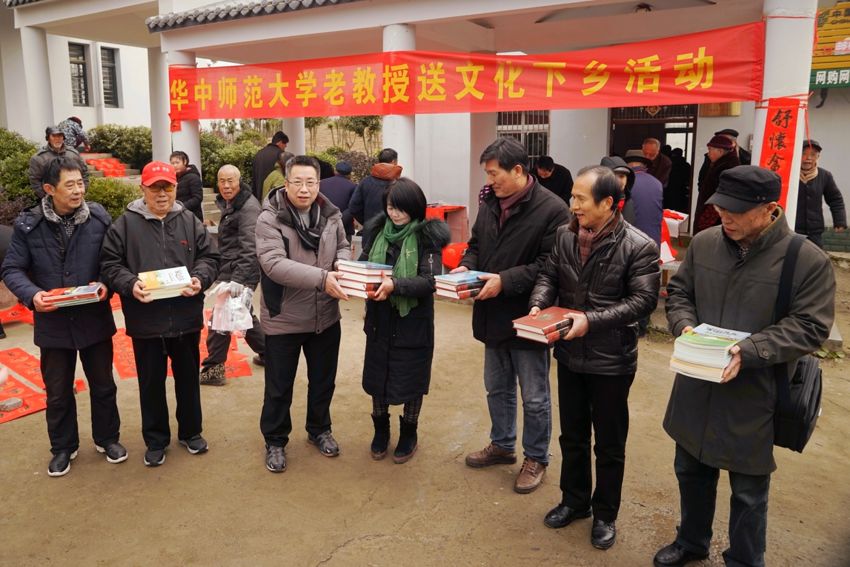 2020年1月17日,是农历小年。一早在浓浓的寒意中,25位老教授与工作人员一行乘车前往仙桃市长埫口镇头谭村,开展“华中师范大学老教授送文化下乡活动”。这次活动,是学校离退休工作处、学校关工委、老教授协会响应中央宣传部、中央文明办、文化和旅游部、国家广播电视总局、中国文联联合印发的通知,定于2020年元旦春节期间,在全国范围内广泛开展“我们的中国梦”——文化进万家活动,而组织开展的。