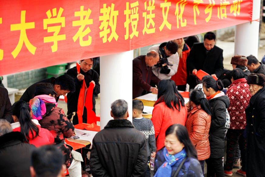 头谭村是华中师范大学的扶贫村,有三位驻村干部。他们告诉村民,本次活动中每个家庭免费领取春联,留守儿童可以领到少儿图书,可以和城里来的老教授话话家常。