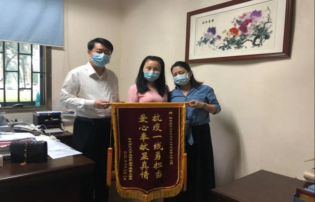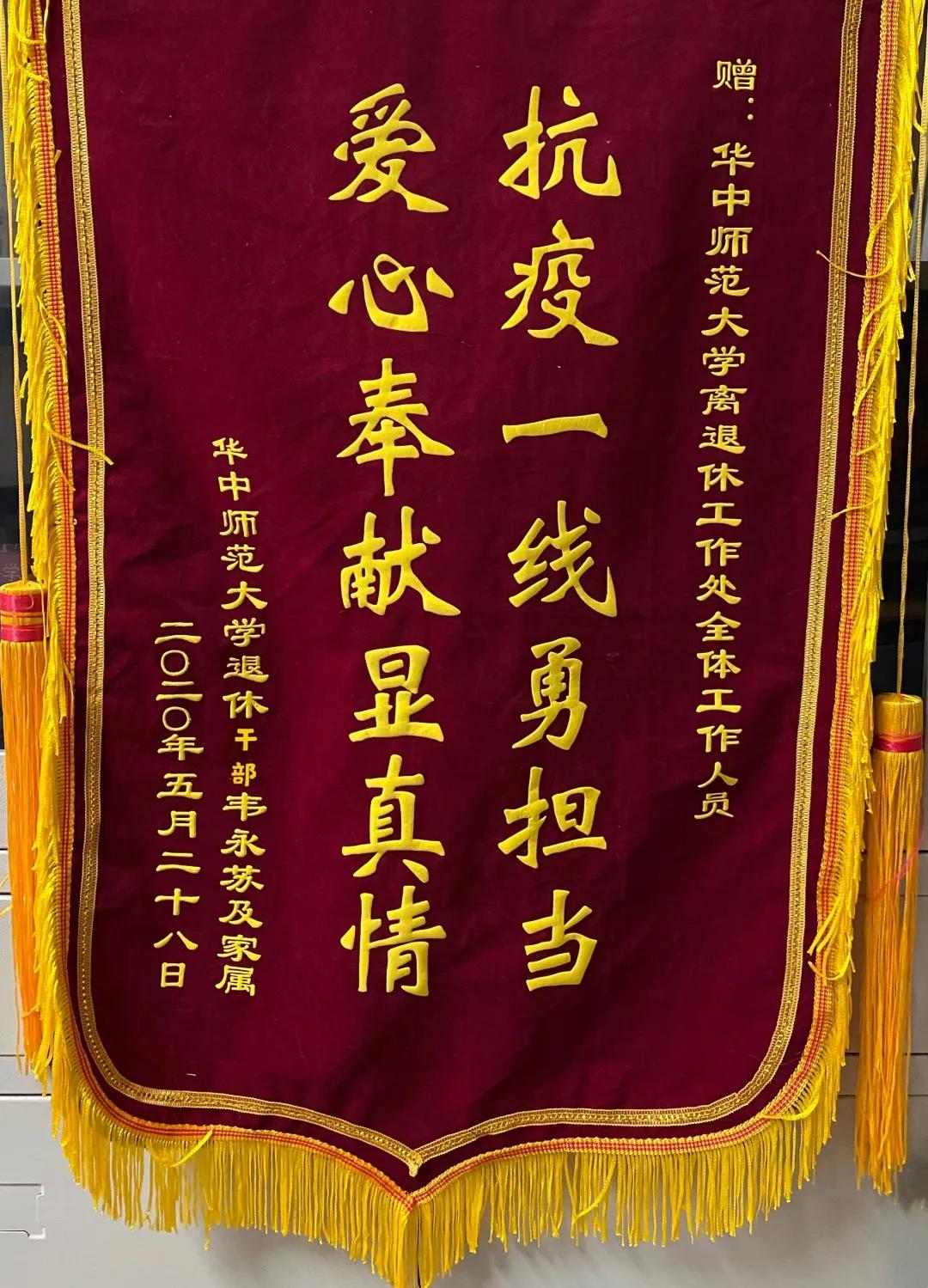 5月29日上午,在离退休工作处何小红处长办公室,93岁高龄的离休老干部韦永苏,委托其亲属送来一面锦旗,上书“抗疫一线勇担当,爱心奉献显示真情”。韦老师的儿媳杨碧芳代表公公婆婆及全家,对处领导和相关工作人员在疫情防控期间给予韦永苏夫妇无微不至的关爱与照顾,表达了深深的感念和诚挚的谢意。