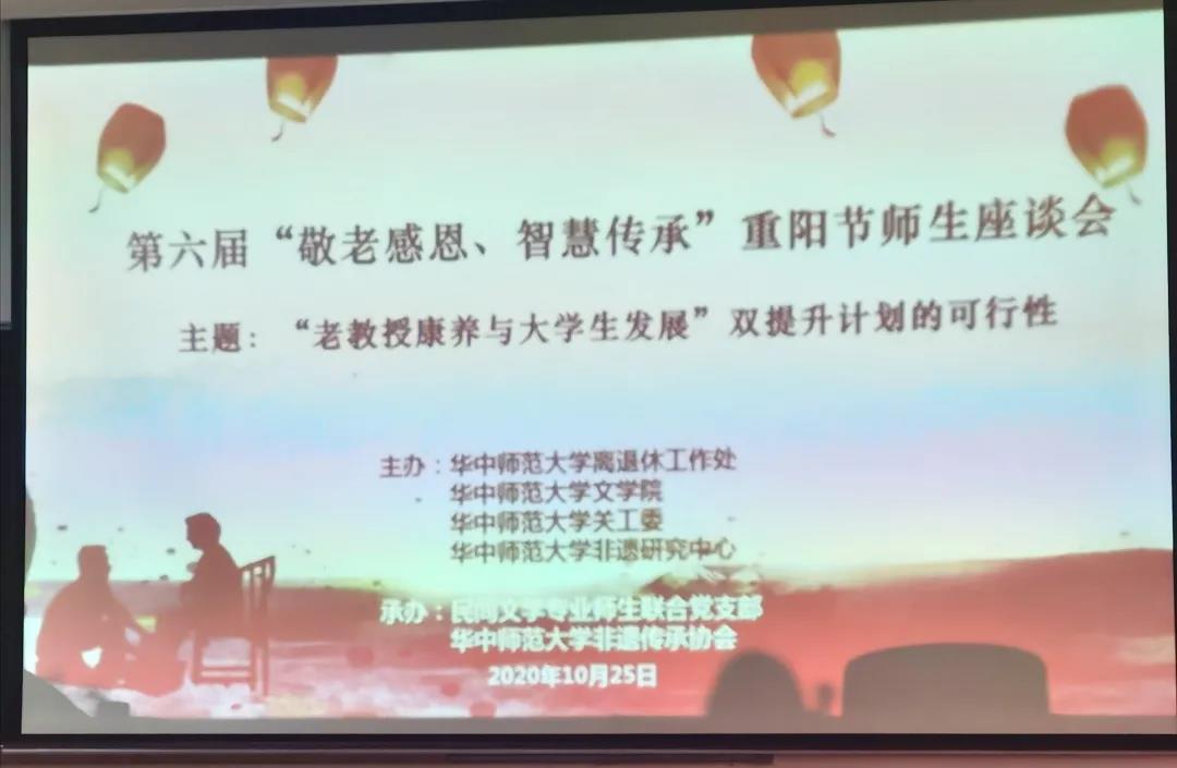 重阳节师生座谈会邀请文学院著名学者刘守华教授、心理学院陈丽梅副教授、校关工委常务副主任谭根稳书记、关工委副主任朱斌书记、文学院孙正国教授参加,离退休工作处副处长潘珞琳、文学院分党委副书记徐福刚等也出席了座谈会。民间文学专业师生联合党支部和华中师范大学非物质文化遗产传承协会的学生代表也参加了座谈会。