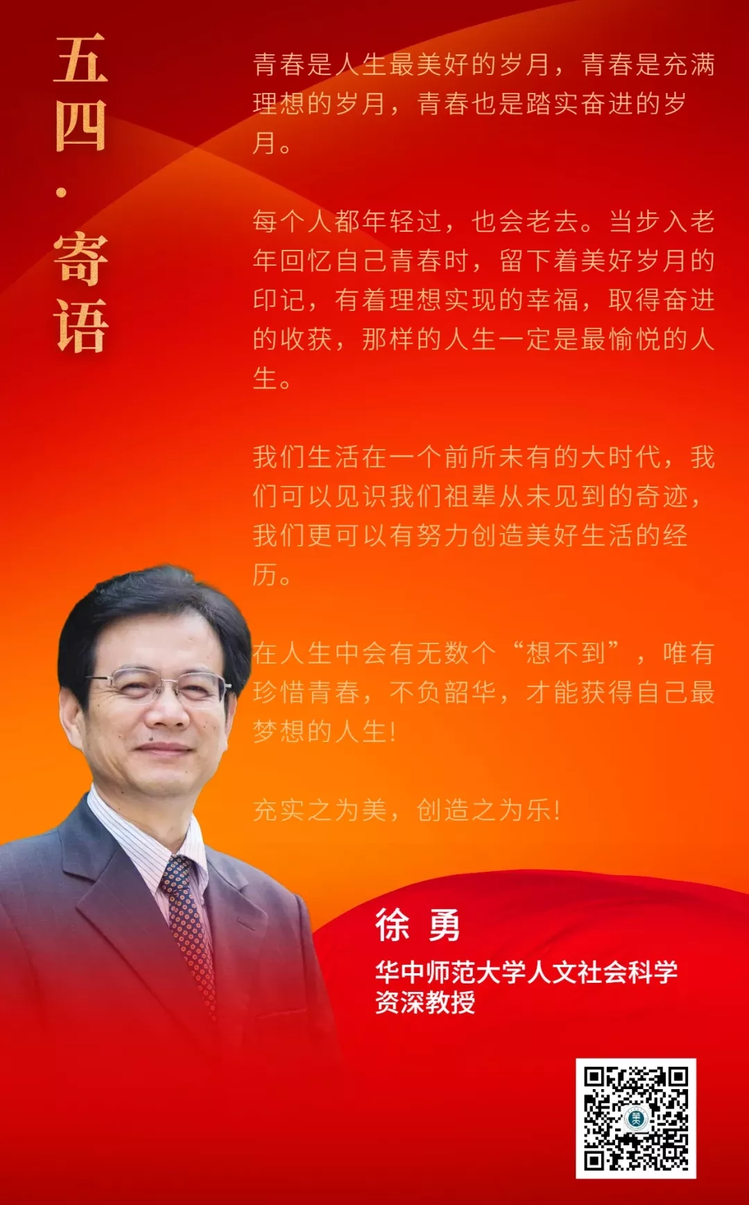 为传承红色基因,在五四青年节到来之际,校关工委邀请全国师德先进个人徐勇教授为青年学生写信一封,以表美好祝愿: