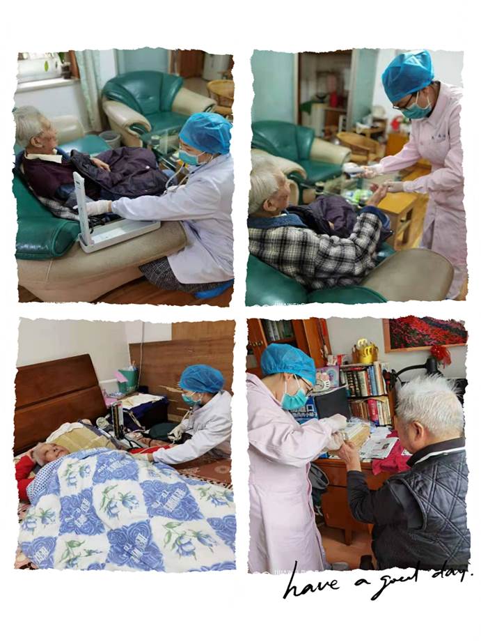 熊萃医生和李莉护士上门为北区教师小区内行动不便的老人进行诊疗服务,医护人员专业地健康服务带给老人们贴心的温暖和关怀。