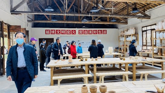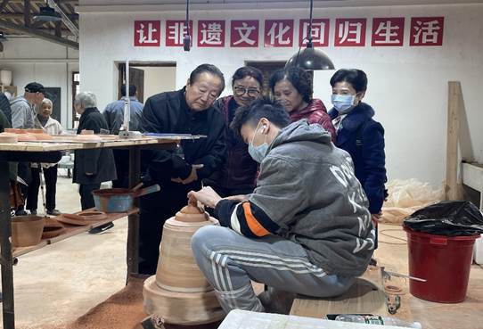 马口陶是中国民陶,有着五百多年的历史,传承基地内恢复重建了马口窑、喻集龙窑,兴建了马口陶大师工作室、马口陶研究院、马口陶工艺坊等设施,几百年的文化,劳动人民的智慧,在这里得到延续和传承。到达传承基地,老同志们在讲解员的引领下饶有兴致地边走边看,认真聆听讲解员的介绍。