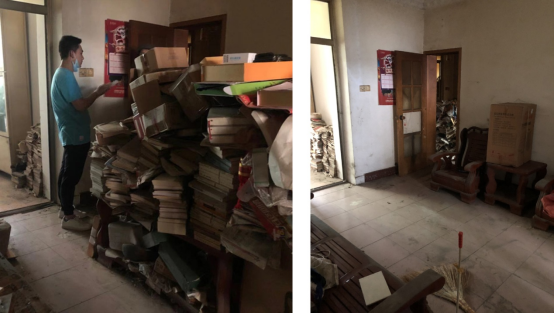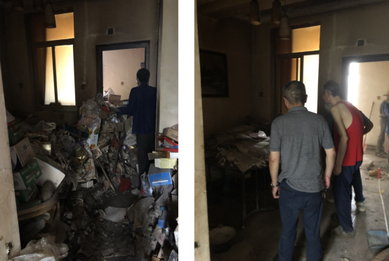 天气炎热、老人家里没有空调电扇,废弃物霉味刺鼻,社区分管环卫工作的吕黎同志不怕脏累,组织带领人员挥汗如雨,4天时间将老人98平米8间房清理殆尽,共整理书籍和学术手稿千余本、旧报纸和纸箱150余麻袋、勾臂垃圾箱4车。