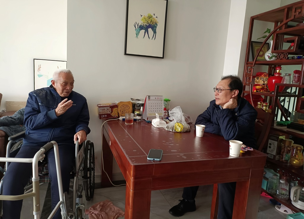 接着,三人拜访了96岁高龄的崔曙庭老师。崔老师是学院领导重点关心的高龄教师之一,院领导曾多次上门、嘘寒问暖。此次见面,分外亲切。纪书记详细了解崔老师的近况,嘱咐他注意身体,祝他健康长寿。