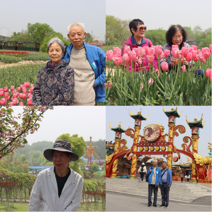 四月中上旬,正是木兰花乡景区内郁金香盛开的季节,郁金香花朵硕大、花瓣繁复、红黄橘粉各种颜色相互交织。退休教职工们欣赏着美轮美奂的花海,感受大自然的美丽与魅力。步入木兰不夜城,老同志们精神抖擞,步履轻盈,一边欣赏特色建筑、享受春日暖阳,一边与老同事、老朋友聊天叙旧。其中涂老师向青年志愿者讲述黄陂区的历史小故事,一时间,其乐融融,欢乐不断。