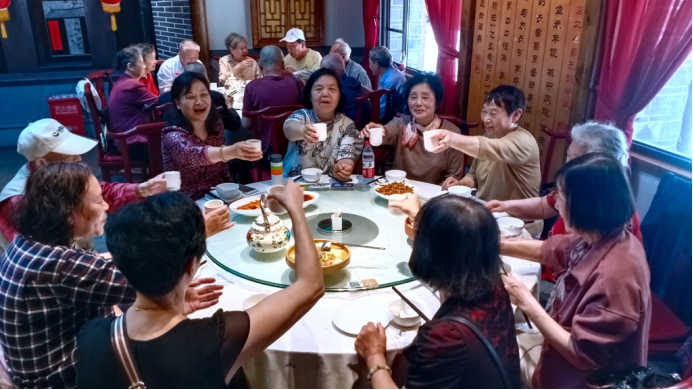 从江滩公园出来后,大家乘车前往老村长私房菜用中餐,觥筹交错,把酒言欢。每个人脸上都洋溢着幸福的笑容。
