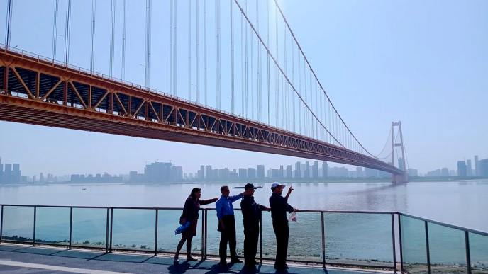 抵达大桥汉阳岸主塔,只见中层桥面上,机动车,非机动车,行人各行其道,金色的桁架、绿色的隔栏,铁灰色的护栏,形成丰富的色彩搭配。老师们在桥上极目远眺上下游,鹦鹉洲大桥,白沙洲大桥、沌口大桥尽收眼底,钦服于祖国的建设成就。