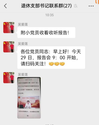为做好本次专题报告会的组织收看,报告会前,离退休工作处高度重视,积极宣传动员、认真组织,及时通过“华大老年”微信公众号、“退休支部书记联系群”微信群等方式发出通知,要求各离退休教职工基层组织和离退休工作处结合实际,灵活采取集中观看、个人自学等方式,组织广大离退休干部收看学习。各单位接到通知后,迅速行动,引导离退休干部和老干部工作者认真收看学习,进一步提高思想认识。