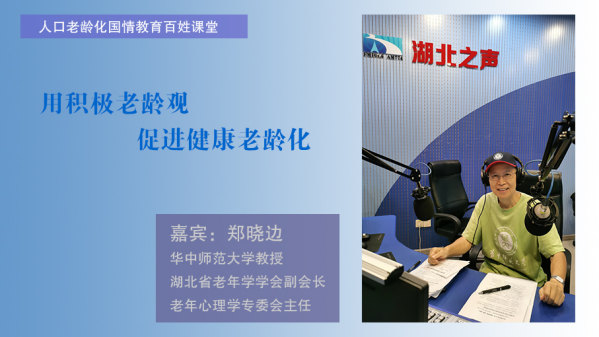 2023年8月18日,华中师大老教授郑晓边接受湖北省广播电视台《老年天地》栏目邀请,为广大老年听众朋友作了“用积极老龄观促进健康老龄化”的线上访谈报告。该项目活动是由湖北省卫健委和老年学学会支持的《人口老龄化国情教育百姓课堂》第25讲,心理访谈报告受到广大听众朋友的热评。