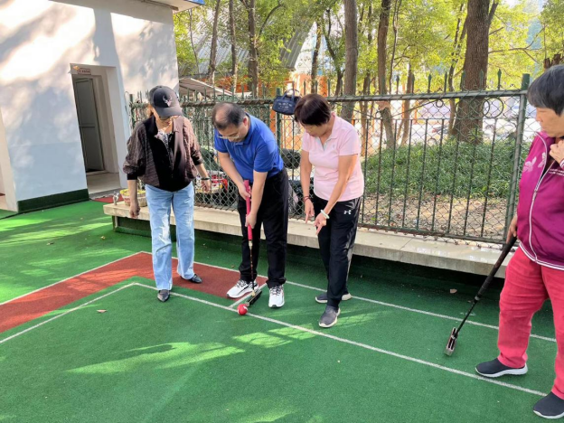 热爱门球运动的老师们齐聚在东区门球场,最为感动的是吊着绷带参加活动的赵明耀老师,大家对门球的热爱可见一斑!老师们在现场互相交流切磋,整个门球场充满了欢乐的气氛。