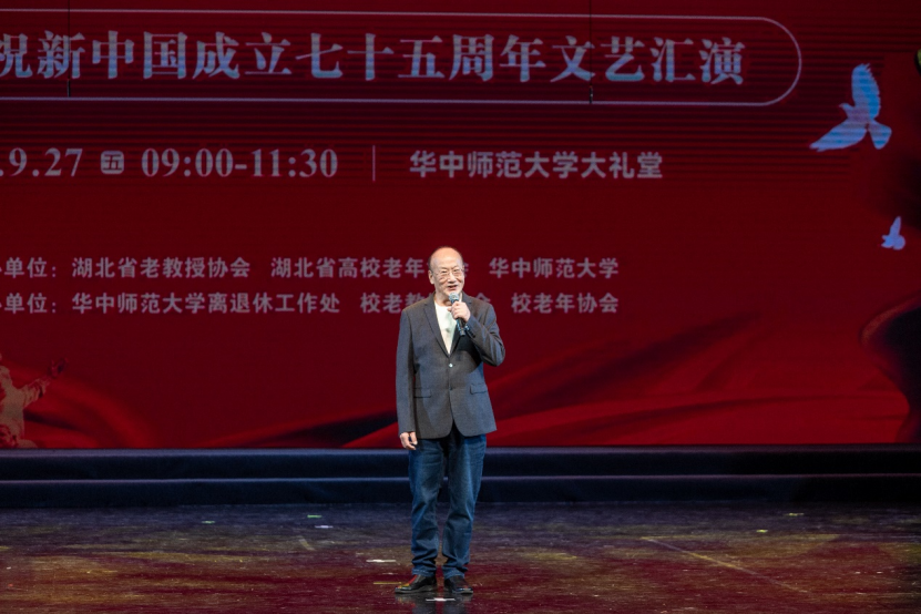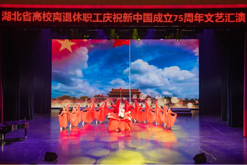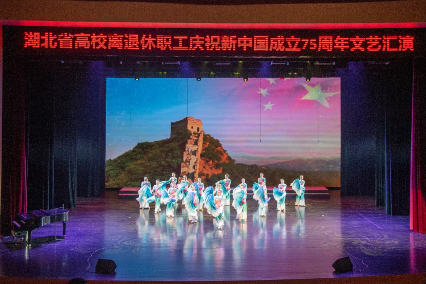 金秋时节,丹桂飘香,神州大地,一派兴旺。9月27日,为热烈庆祝新中国成立75周年,由湖北省老教授协会、湖北省高校老年协会、华中师范大学联合举办的《奋进新时代 银发颂祖国—热烈庆祝新中国成立七十五周年文艺汇演》在华中师范大学大礼堂隆重举行。汇演活动用舞蹈和歌声抒发对祖国的爱恋与祝福,赞美祖国翻天覆地的变化及人们对美好生活的向往与追求。湖北省国际文化交流中心理事长、湖北省原副省长赵斌同志,湖北省关心下一代工作委员会副主任、湖北省教育厅原厅长刘传铁同志,湖北省高校老年协会会长丁振国教授,湖北省老教授协会会长邓兰英教授,华中师范大学党委副书记查道林教授与1000余名老同志欢聚一堂,观看演出。