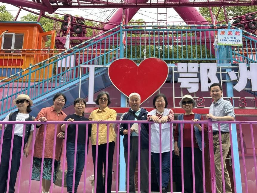 首站抵达国家4A级景区鄂州西山风景区。西山古称樊山,因位于吴王古都鄂州之西而得名,主峰海拔170米,全山植被覆盖率达98%,满山苍翠,气候宜人,素有“楚门东户”之誉。老师们漫步于郁郁青青、鲜花盛开的西山风景区,时而驻足赏景,时而三五结伴而行,步履轻盈如少年。游玩中老师们互相用手机定格相视而笑的瞬间,笑声中更显“银发初心”的炽热。