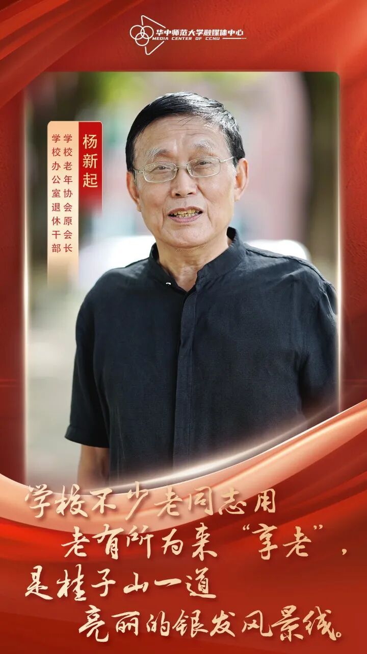 “学校不少老同志退休不褪色,他们以被党和人民的事业需要为荣,以学术为生存方式为骄,用老有所为来‘享老’,是桂子山上一道亮丽的银发风景线。”杨新起也是其中的一员。今年,他策划的《新时代基层老年协会建设的理论与实践》即将付梓。杨新起觉得,“我有比较丰富的老协基层工作经验,在这方面开展一些思考和研究,为推进实施积极应对人口老龄化国家战略做些力所能及的事情,这很有意义。”