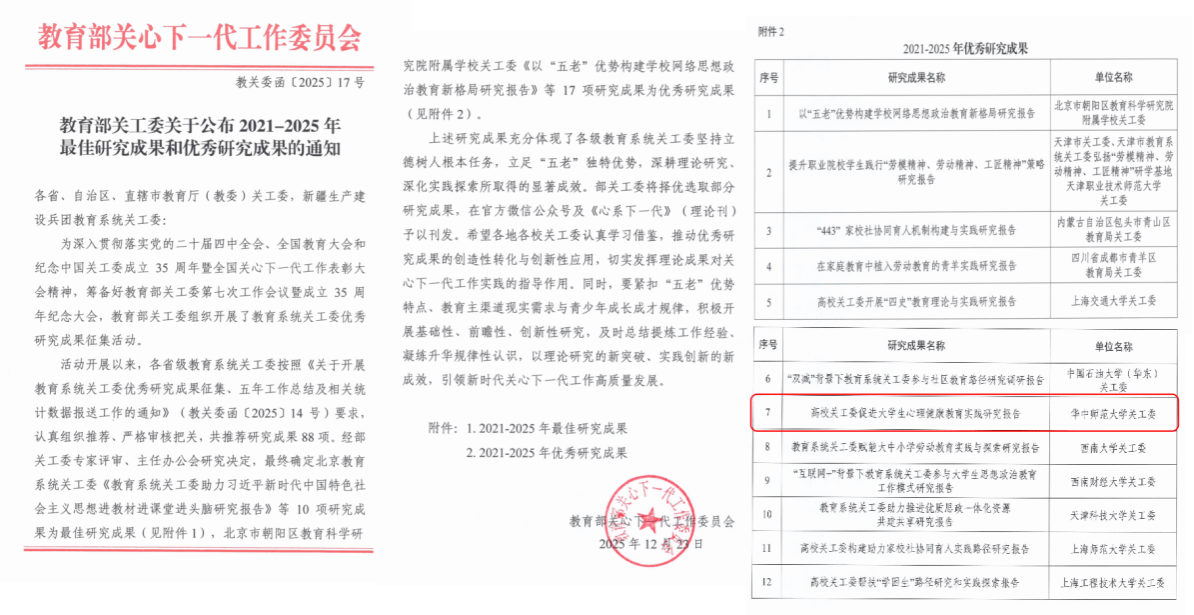 为深入贯彻落实党的二十届四中全会、全国教育大会和纪念中国关工委成立35周年暨全国关心下一代工作表彰大会精神,筹备好教育部关工委第七次工作会议暨成立35周年纪念大会,教育部关工委组织开展了教育系统关工委优秀研究成果征集活动。活动开展以来,各省级教育系统关工委按照相关要求,认真组织推荐、严格审核把关,共推荐研究成果88项,经部关工委专家评审、主任办公会研究决定,最终确定10项最佳研究成果和17项优秀研究成果。我校关工委报送的“高校关工委促进大学生心理健康教育实践研究报告”获优秀研究成果表彰,也是湖北省教育系统唯一一个获此项表彰单位。