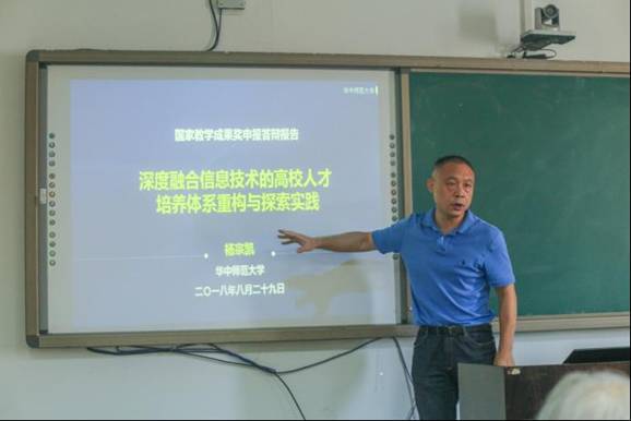 紧接着,副院长杨九民教授结合自己担任国家级教学成果奖评委的经历,作了题为《从“国家级教学成果奖”到“师范专业认证”》的报告。杨九民传达了新时代全国高等学校本科教育工作会议精神,介绍了我校参评国家级教学成果奖的答辩情况,并以“适应新形势,落实新标准,育好新师资”为主线,就如何做好该院本科教育工作特别是师范专业认证工作作了重点介绍。