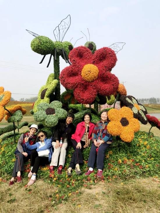 上午10时,大家乘车到达了目的地。一下汽车,老师们就被眼前的花海惊呆了——这哪里是秋天?分明是春天!朵朵花儿都盛开着,尤其是金色的向日葵迎着太阳露出了笑脸。老师们迫不及待地扑进了花的怀抱,拿出手机、相机,不停地拍起美照来。看,85高龄的余老师与老伴相携,来了一张合影;