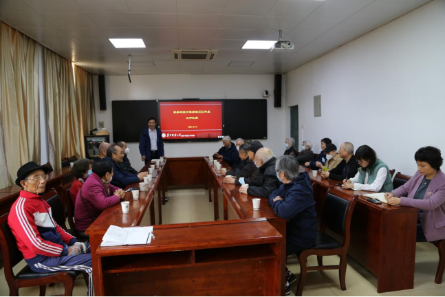 刘成竹代表学院领导班子衷心感谢学院全体退休老师一直以来对学院发展做出的支持与贡献,强调退休老同志是学院的宝贵财富,今后将继续关心关爱老同志。并从人才培养、队伍建设、科学研究、党建思政工作等方面向老同志汇报了数统学院2022年的工作开展情况以及学院下一步的发展计划。