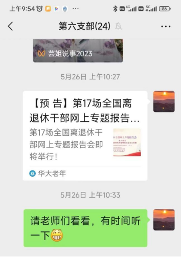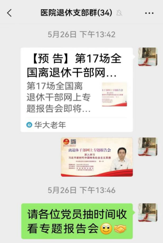 为做好本次专题报告会的组织收看,报告会前,离退休工作处高度重视,积极宣传动员、认真组织,及时通过“华大老年”微信公众号、“退休支部书记联系群”微信群等方式发出通知,要求各离退休教职工基层组织和离退休工作处结合实际,灵活采取集中观看、个人自学等方式,组织广大离退休干部收看学习。各单位接到通知后,迅速行动,引导离退休干部和老干部工作者认真收看学习,进一步提高思想认识。