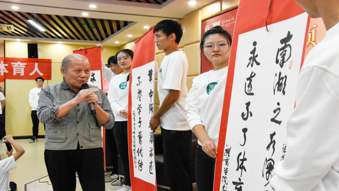 封官声教授赠送百廿校庆主题书法,“南湖之水深千尺,永远不了体育情”“华中师大远流远,不尽学子万代传”表达对教育的热爱,对体育的奉献,对学校的深情。希望体育学院桃李天下,学子满堂。 退休老师们虽然离开了工作岗位,但依然老有所为,心系学院建设发展,奉献自我。学院领导和老师们表示会铭记前辈们的奋斗历史,秉持“体为国本,育人最先”的育人精神,在前辈们的基础上继续建设好体育学院,创造新的辉煌。