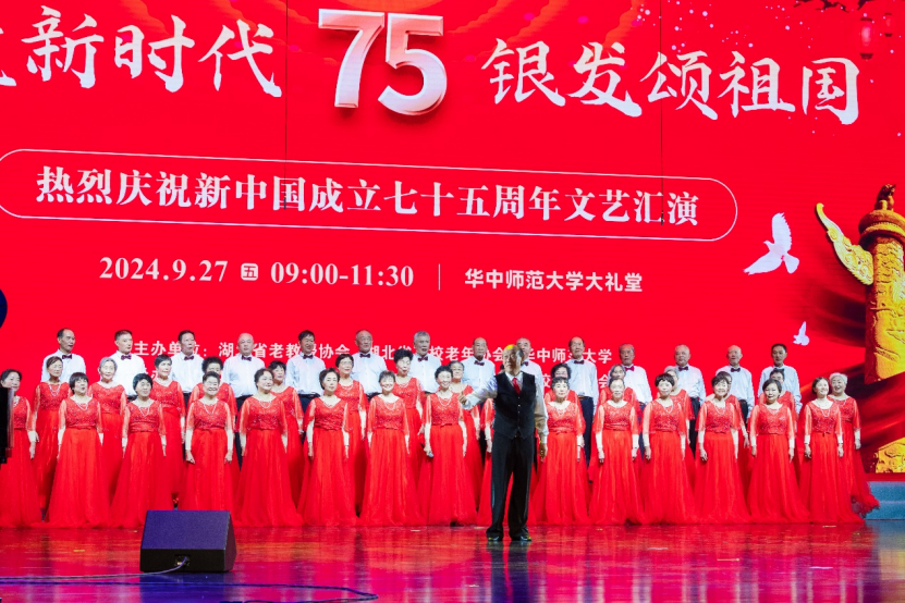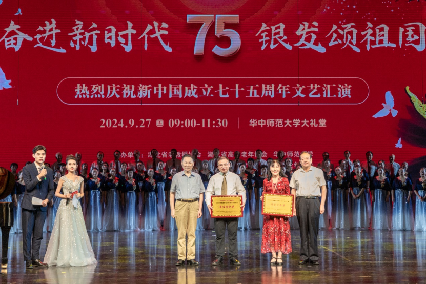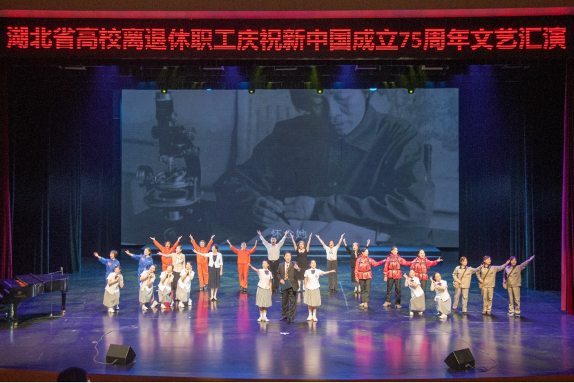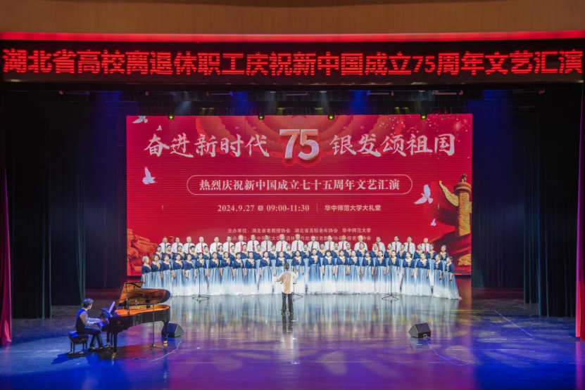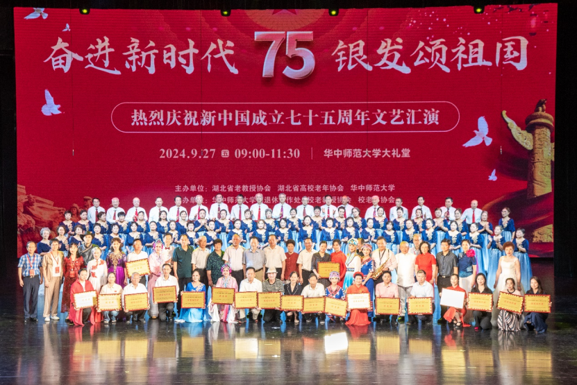 金秋时节,丹桂飘香,神州大地,一派兴旺。9月27日,为热烈庆祝新中国成立75周年,由湖北省老教授协会、湖北省高校老年协会、华中师范大学联合举办的《奋进新时代 银发颂祖国—热烈庆祝新中国成立七十五周年文艺汇演》在华中师范大学大礼堂隆重举行。汇演活动用舞蹈和歌声抒发对祖国的爱恋与祝福,赞美祖国翻天覆地的变化及人们对美好生活的向往与追求。湖北省国际文化交流中心理事长、湖北省原副省长赵斌同志,湖北省关心下一代工作委员会副主任、湖北省教育厅原厅长刘传铁同志,湖北省高校老年协会会长丁振国教授,湖北省老教授协会会长邓兰英教授,华中师范大学党委副书记查道林教授与1000余名老同志欢聚一堂,观看演出。