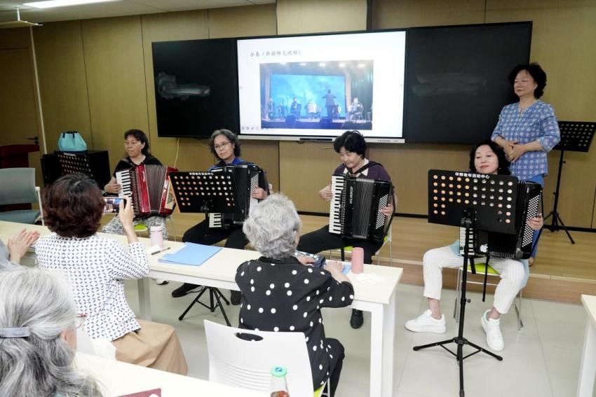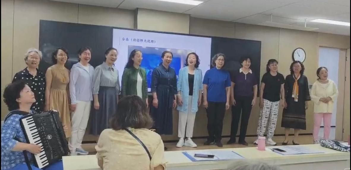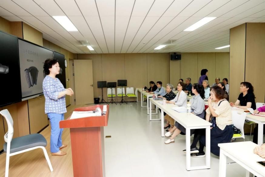 在互动环节,王笑合老师亲自伴奏,老年大学“笑声女子组合”艺术团带来小合唱《山楂树》。琴声娴熟优美,歌声悠扬婉转,现场气氛热烈,掌声阵阵。随后,几位刚刚接触手风琴的学员在王老师的悉心指导下,大胆走上讲台展示合奏与独奏。尽管演奏略显生涩,但她们认真的态度和对音乐的热爱,感染了在场的每一个人。