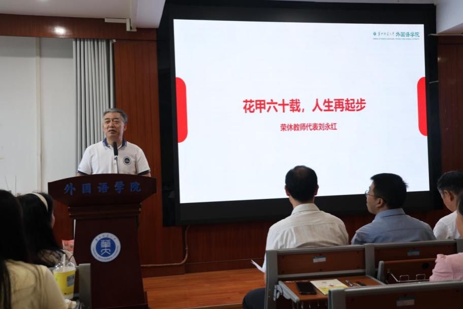 随后,荣休教师代表刘永红教授发表感言。他以“花甲六十载,人生再起步”寄语全体同仁,深情感谢伟大时代赋予的宝贵机遇,感谢学校提供的广阔平台与坚实支撑,更感谢学院大家庭始终如一的温暖关怀与精神激励。他的话语朴实而深情,让人感受到一位教育者的赤诚之心。