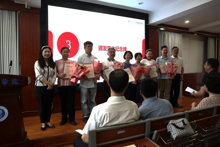 学院党委书记麻旎、院长罗良功为七位荣休教师颁发纪念铭牌,铭牌上刻录着他们的工作历程,承载着全院师生对他们的敬意与祝福。
