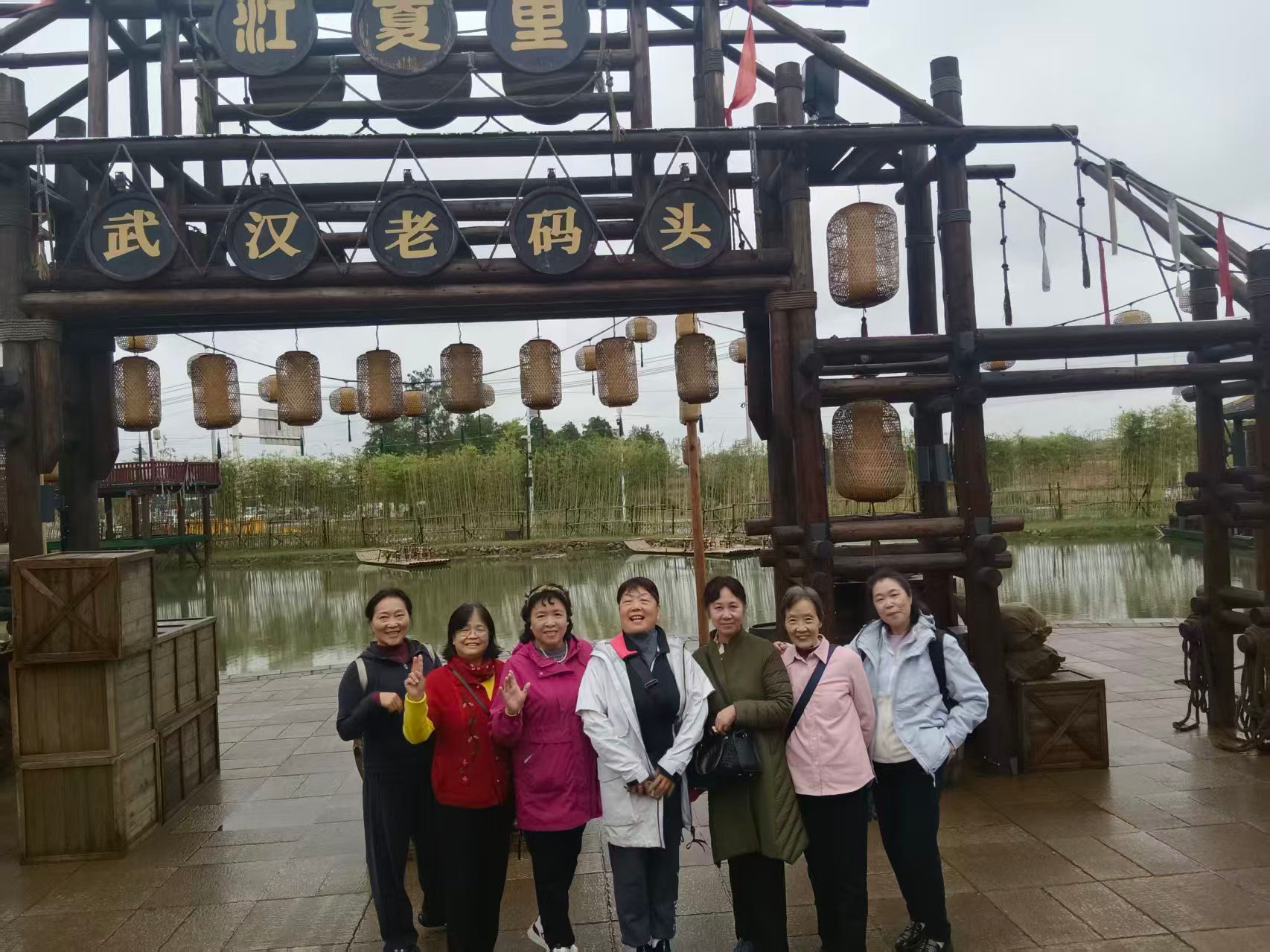 第二个景点是江夏里。江夏里的定位是以武汉老码头文化为主题的文化美食街区。在街区里,老师们看到耳熟能详的地道武汉招牌,纷纷走上前去购买品尝。亭台楼阁依着小山头而建,错落有致地在人工河道旁铺陈开来。退休老师们中有很多是地道的武汉人,码头熙熙攘攘的人群,腾空而起的美食蒸汽,吆喝声,小孩子的欢笑声,这一时刻仿佛都在他们的眼前浮现,让他们穿越到往昔岁月。